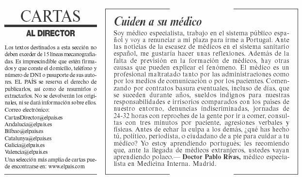 Cartas como ésta hacen que me alegre, porque se dice alto y claro lo que está pasando aquí, la cantidad de profesionales quemados,hartos de trabajar en condiciones difíciles,con una lista de pacientes impresionantes que se maquilla cerrando la agenda del médico para que no figuren en las estadísticas; no es lógico que alaben la calidad de nuestra formación desde el extranjero, que los contribuyentes paguen parte de nuestra formación ( tengo entendido que es así en las universidades públicas) y luego nos vayamos del país. Algo está fallando.