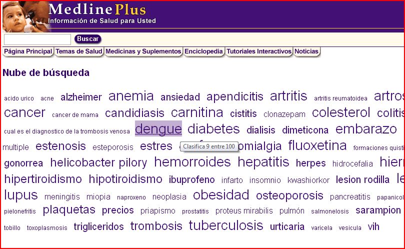 La nube de búsqueda de MedlinePlus nos da una idea ya que muestra los cien términos más consultados en la caja de búsqueda de MedlinePlus sitio web de los Institutos Nacionales de la Salud para pacientes. Producido por la Biblioteca Nacional de Medicina.