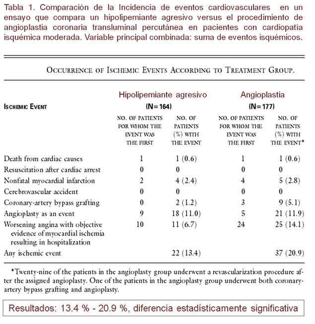 -Tutor: Créame, le hubiera dado igual. Aquí un angor vale lo mismo que una muerte o un infarto. Son eventos cardiovasculares, any ischemic event, cualquier evento cardiovascular. Fíjese, si en una rama hubiera habido tres angor y en la otra tres muertos hubiera habido un resultado de empate. ¿Le parece lógico?