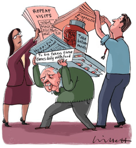 Los avances en el diagnóstico y el tratamiento tienen, por tanto, el efecto paradójico de incrementar cada vez más el trabajo de estar enfermo. Los pacientes que no pueden soportarlo, por último experimentan consecuencias iatrogénicas y una peor calidad de vida, seguramente del mismo modo que los que se ven afectados por los accidentes o errores médicos. Los clínicos no pueden dar la respuesta adecuada a este problema. Carecen de las herramientas para detectar los pacientes que están abrumados por las cargas del tratamiento y de las estrategias para aligerar estas cargas.