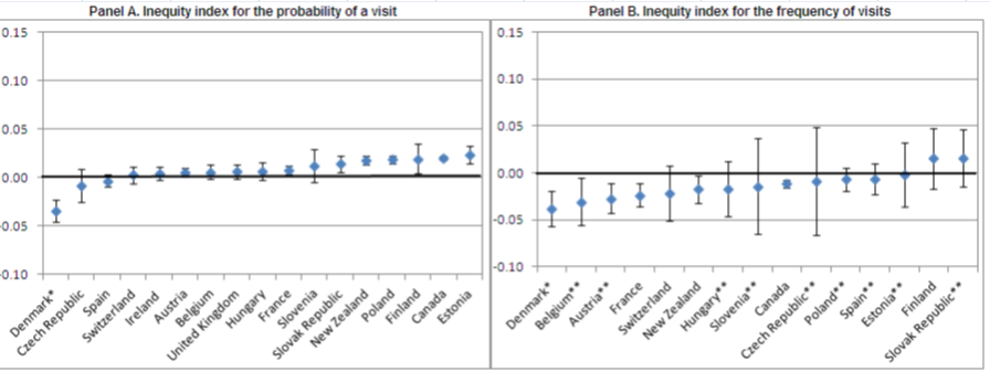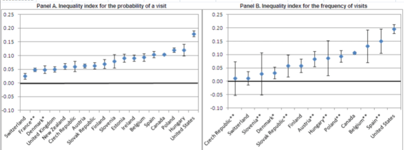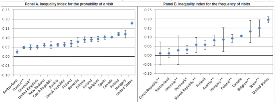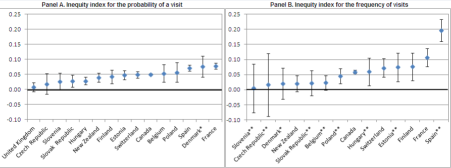La utilización de este tipo de servicios muestra en casi todos los países un patrón pro-ricos, que se mantiene al obtener los índices H de inequidad, cuyos valores en el caso de España y en lo relativo a frecuencia de consultas médicas serían los más inequitativos de la OCDE (los autores no han podido obtener datos de USA y Alemania), hasta el punto de que habría que redistribuir de ricos a pobres el 14,7 % de todas las consultas especializadas hispanas, para lograr la equidad.