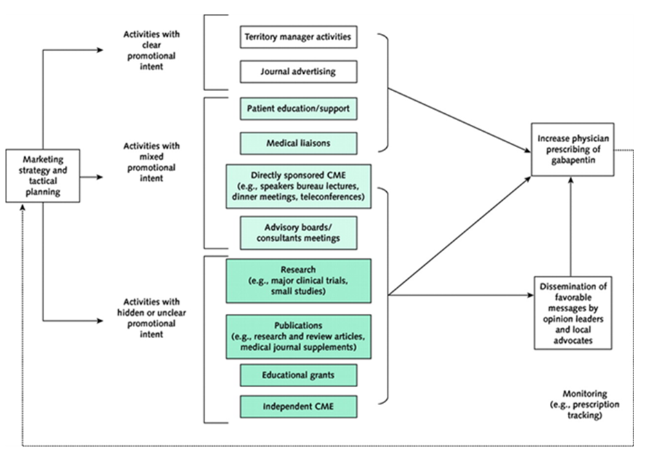Conclusión: Las actividades consideradas tradicionalmente independientes del propósito promocional, incluyendo la formación médica continuada y la investigación, se utilizaron ampliamente para promover gabapentina. Se necesitan nuevas estrategias para garantizar una clara separación entre la actividad científica y comercial.
