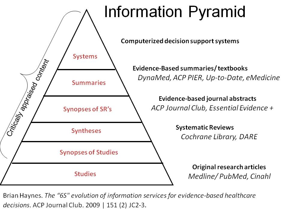 Uno de los aportes de la medicina basada en la evidencia menos reconocidos, pero no menos importante es el de haber dado un marco conceptual a la utilización de la información por el médico. Con aportaciones de las ciencias de la información y sentido práctico, han creado conceptos como la pregunta clínica y su formulación, o el modelo piramidal 4-6 S que introduce a las búsquedas, no solo la pertinencia o exactitud, sino también el concepto de tiempo o esfuerzo empleado en localizar y utilizar la información requerida.
