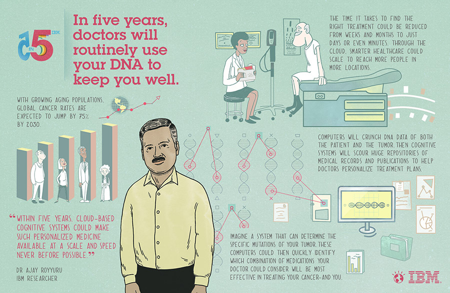 En cinco años, los grandes volúmenes de datos y los sistemas cognitivos en la nube, junto a los avances en la investigación y las pruebas genómicas, podrían ayudar a los médicos a diagnosticar con precisión el cáncer y a crear planes personalizados de tratamiento para millones de pacientes en todo el mundo. Las máquinas inteligentes analizarán extensos archivos de registros médicos y de publicaciones, los aprenderán y rápidamente proporcionarán una respuesta específica para los oncólogos sobre las opciones de tratamiento. Aunque la atención personalizada del cáncer a nivel genómico ha estado en el horizonte desde que los científicos secuenciaron por primera vez el genoma humano, realmente son pocos los médicos con acceso a las herramientas y el tiempo para evaluar los conocimientos disponibles a este nivel.