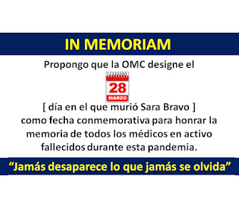 Sara Bravo y el resto de profesionales fallecidos a pie de obra atendiendo a los pacientes ya son nuestra memoria histórica profesional. Su recuerdo no puede ser “encapsulado” en las profundidades de nuestro cerebro. Necesitamos tenerles presentes. Por ello, desde aquí propongo que la Organización Médica Colegial designe el día 28 de marzo, día en el que murió Sara Bravo, como fecha conmemorativa para honrar la memoria de todos los médicos en activo fallecidos durante esta pandemia. Mientras tanto, sirva este texto para recordar a Sara y al resto de profesionales sanitarios y sociosanitarios fallecidos por covid-19 en su trabajo, en su labor asistencial y de cuidado a los pacientes, para dejar constancia de su entrega en el cumplimiento de su deber y como apoyo en el recuerdo a sus familiares. Siempre estarán con nosotros porque jamás desaparece lo que jamás se olvida.
