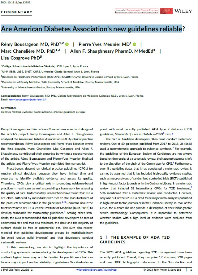 Los autores concluyen que los médicos asistenciales hacen bien en delegar las búsqueda y critica de la evidencia en otros expertos, siempre que dichos expertos respeten el enfoque que recomienda la medicina basada en la evidencia. Sin embargo, no parece que éste sea el caso de las recomendaciones Standards of Care in Diabetes-2023 de la ADA.