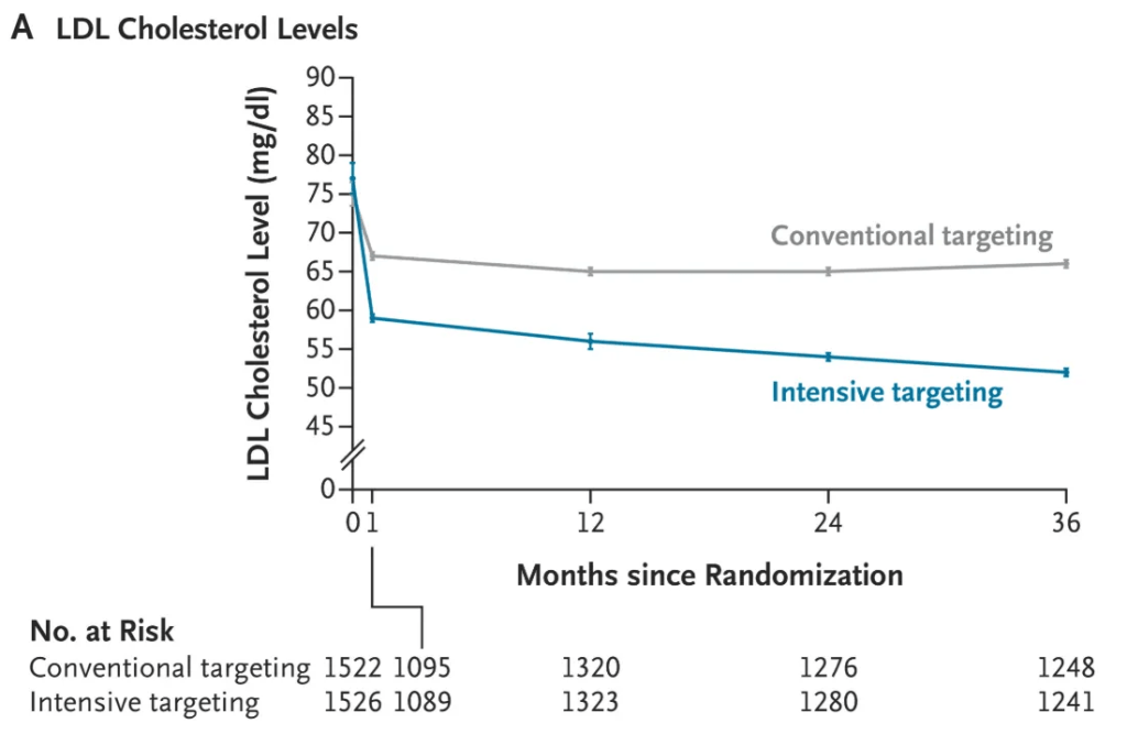 Se trata de un estudio en el que se seleccionó a pacientes con enfermedades cardiovasculares y se estableció como objetivo que un grupo alcanzara un nivel de LDL de 55 y otro de 70. Sin duda, hubo una diferencia entre ambos grupos en cuanto al impacto del tratamiento: