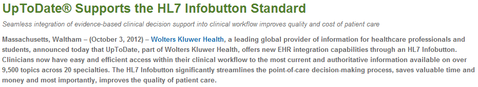 Tras el desarrollo inicial de los administradores infobutton , los HL7 ha establecido un método estándar para conectar los sistemas de información clínicos y para vincular estos infobutton a los recursos electrónicos de conocimiento. Sin embargo, la personalización de un gestor de este tipo no es una tarea simple. Para utilizar correctamente un administrador infobutton, se necesita tener una comprensión clara de las necesidades de información de los usuarios, conocer los recursos están disponibles para resolver esas necesidades, entender cómo vincular automáticamente a esos recursos, e identificar las terminologías utilizado en el sistema HCE que puede ayudar con la automatización de la recuperación de información. Uptodate que desde su creación se ha ido consolidado como una herramienta de información fundamental para los médicos, ha dado el primer paso en incorporar estos infobutton como una forma de que sus contenidos actualizados periódicamente y basados en la evidencia que ayuden, ahora de manera más directa, a los profesionales de la salud a tomar las mejores decisiones en el mismo lugar donde atiende al paciente.