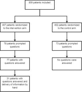n un periodo de tiempo que fue de marzo a agosto de 2010 los pacientes que ingresaron al servicio de medicina interna fueron asignados a un grupos de intervención (servicio de respuestas) y otro control. Se recogieron todas las interrogantes que surgieron durante las visitas de la mañana, sólo se busco la respuesta las preguntas obtenidas a partir de las discusión relativas a los pacientes hospitalizados que fueron asignados al grupo de intervención (y no de las obtenidas a partir de los casos de pacientes asignados al grupo control). Una vez obtenida la solución fue remitida por correo electrónico diariamente a todos los miembros del equipo médico. Los correos electrónicos incluían un breve resumen de la literatura encontrada , una evaluación crítica de los documentos y el articulo origina en formato PDF. En algunos casos, la literatura fue impresa y entregada en mano, directamente a los profesionales involucrados.