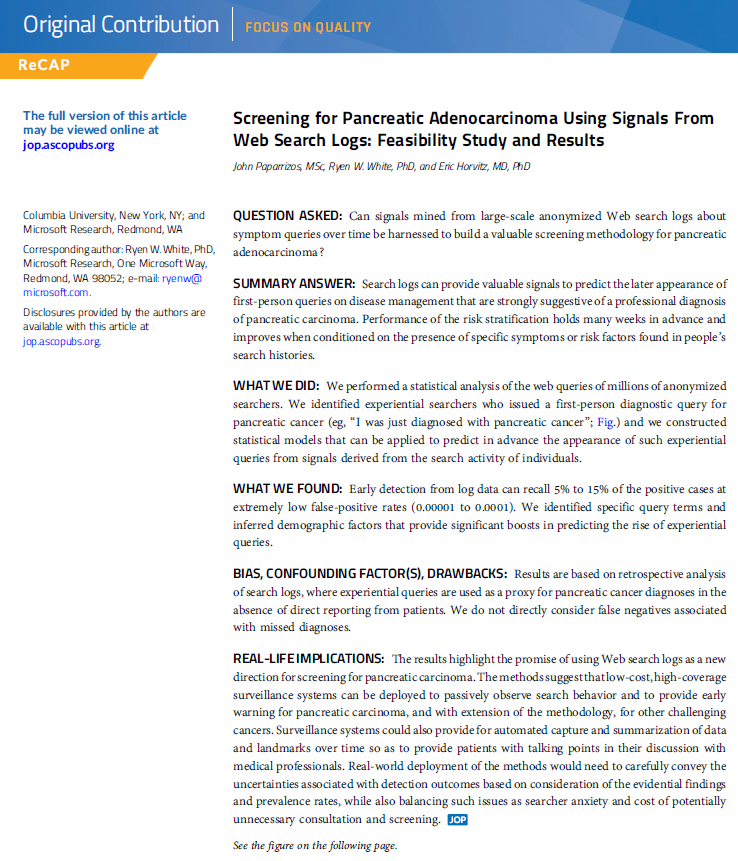 Una vez identificados estos dos grupos se obtuvieron retroactivamente, los registros de la actividad de búsqueda para examinar los patrones de síntomas y factores de riego, que son expresados como búsqueda. A partir de estos se construyeron clasificadores estadísticos que predecían la aparición futura de cáncer de páncreas. Es decir, las consultas históricas originaban patrones a partir de señales observadas en los registros de búsqueda que permitían predecir el futuro de aparición de experiential searches, pudiéndose identificar de 5% a 15% de los casos, preservando al mismo tiempo tasas extremadamente bajas de falsos positivos. Los autores concluyen que las señales (o búsquedas sobre determinados síntomas y factores de riego) en los registros de búsquedas web muestran las posibilidades de predicción de un diagnóstico, cercano en el tiempo de adenocarcinoma de páncreas; a partir de combinaciones de señales temporales sutiles reveladas en las consultas de los buscadores.