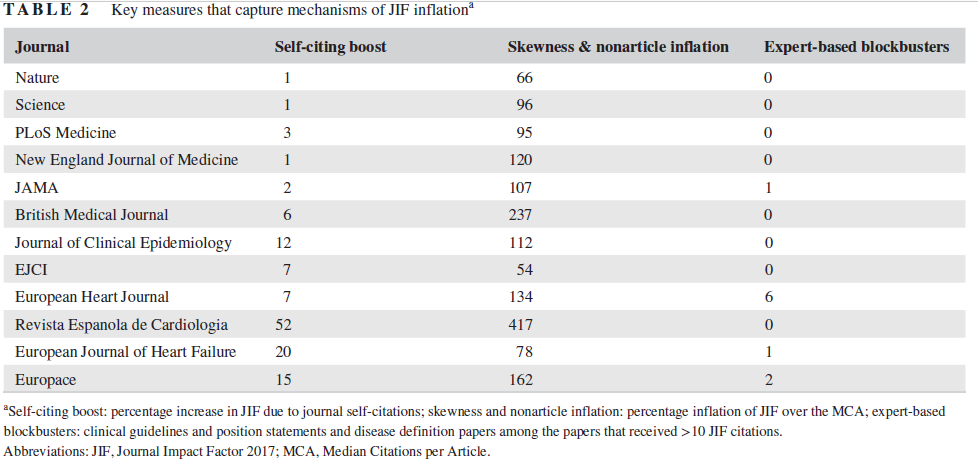 Una tabla con la representación numérica de estas medidas inflacionistas del FI en revistas generales y específicas de cardiología, entre las que desgraciadamente está la española Revista Española de Cardiología , muestra que la proporción de auto-citación, y la asimetría e inflación del FI es estas última revistas probablemente sea desproporcionada y explique la subida (artificial) del FI de estas publicaciones en los últimos años.