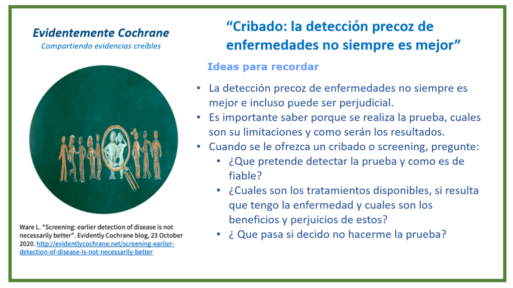 Traducido de Ware L. Screening: earlier detection of disease is not necessarily better. Evidently Corane blog. 23 de octubre de 2020.