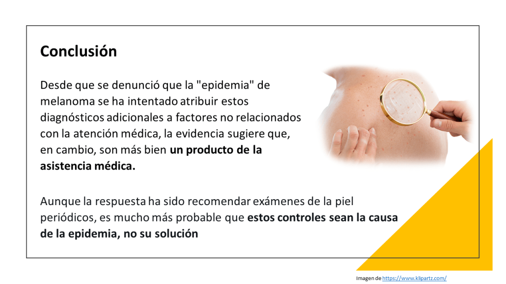 ¿Por qué le hice esta pregunta? : ¿y si no hago nada? Entre 1975 y 2017, los diagnósticos de melanoma se multiplicaron por seis, mientras que las tasas de mortalidad se han mantenido más o menos constantes. Este patrón indica que el melanoma se está sobrediagnosticando, lo que significa que los médicos están detectando anomalías que nunca habrían dañado a los pacientes si no se hubieran tratado.