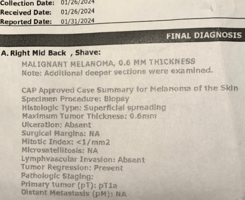 Días después, la Dra. M. me llamó con los resultados de la biopsia. El grano que tenía en el muslo era un carcinoma basocelular. No es gran cosa, los carcinomas basocelulares rara vez o nunca son mortales y bastante tratables; ella podría quemarlo en un procedimiento rápido e indoloro. Pero la mancha de la espalda es un melanoma maligno. Está en estadio pt1a, con un grosor máximo de 0,6 milímetros, o 1/40 de pulgada (véase el informe de la biopsia más arriba).