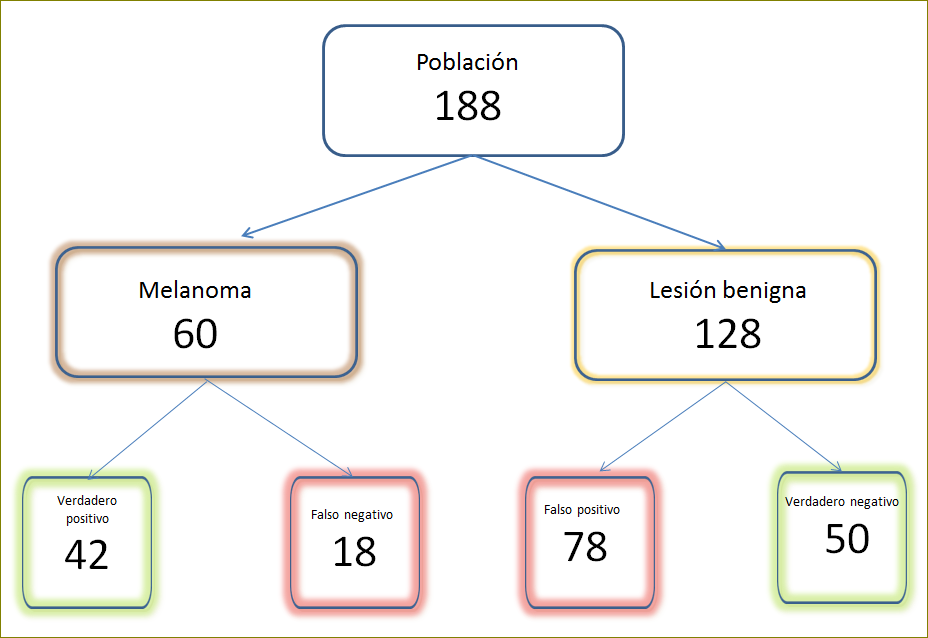 En cada aplicación se contrastaron un total de 188 imágenes de lesiones pigmentadas, de las cuales 60 eran melanomas y 128 lesiones benignas. La sensibilidad de las aplicaciones, o lo que es lo mismo el porcentaje de verdaderos positivos entre todas lesiones malignas, varió de 6,8% a 98,1% que fue precisamente la aplicación en la que el dermatólogo estaba involucrado. La especificidad y los valores predictivos se pueden ver en el artículo. Para los que les cuenta entender estos arcanos de la interpretación de las pruebas diagnósticas, los mismos datos se pueden representar en forma de frecuencias naturales, que parecen más intuitivas que las probabilidades, como hacemos en la figura con los datos de una de las apps que tuvo resultados promedio.