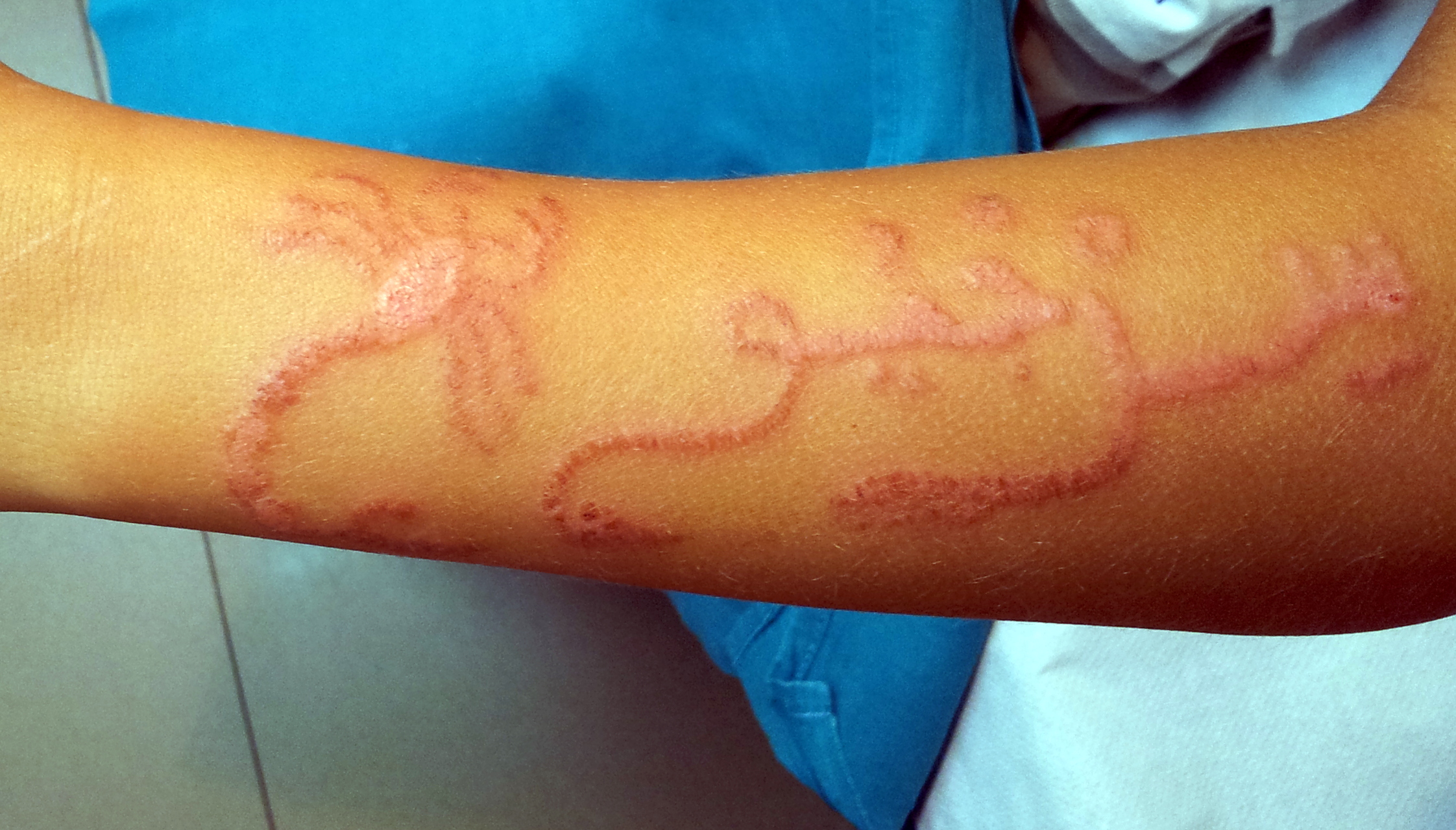 La reacción se distingue por la aparición de pápulas eritematosas, vesículas y ampollas que desaparecen en unas semanas, pero que en ocasiones dejan lesiones residuales hiper o hipopigmentadas.