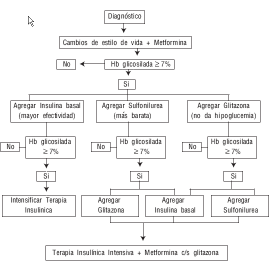 «En la última revisión de la Asociación Americana de Diabetes de enero de 2007, se propone el nuevo algoritmo para el manejo de la diabetes mellitus tipo 2 que se muestra en la figura. Este surge de un consenso publicado el año pasado por la ADA y la Asociación Europea para el Estudio de la Diabetes.