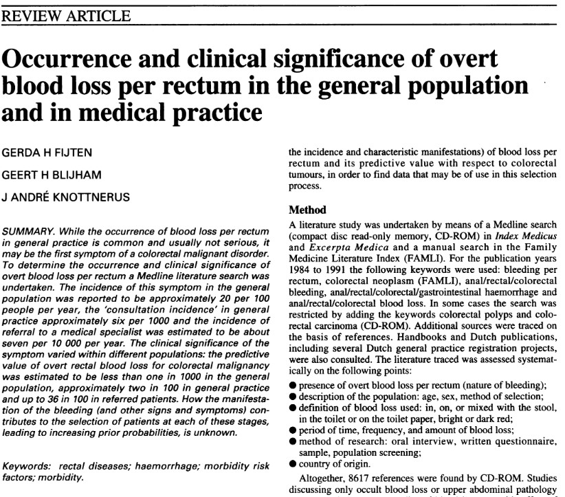 Bien, pero hablemos del artículo. Se titula: Occurrence and clinical significance of overt blood loss per rectum in the general population and in medical practice (Frecuencia e importancia clínica de la pérdida manifiesta de sangre por recto en la población general y en la práctica médica) y el resumen traducido es este