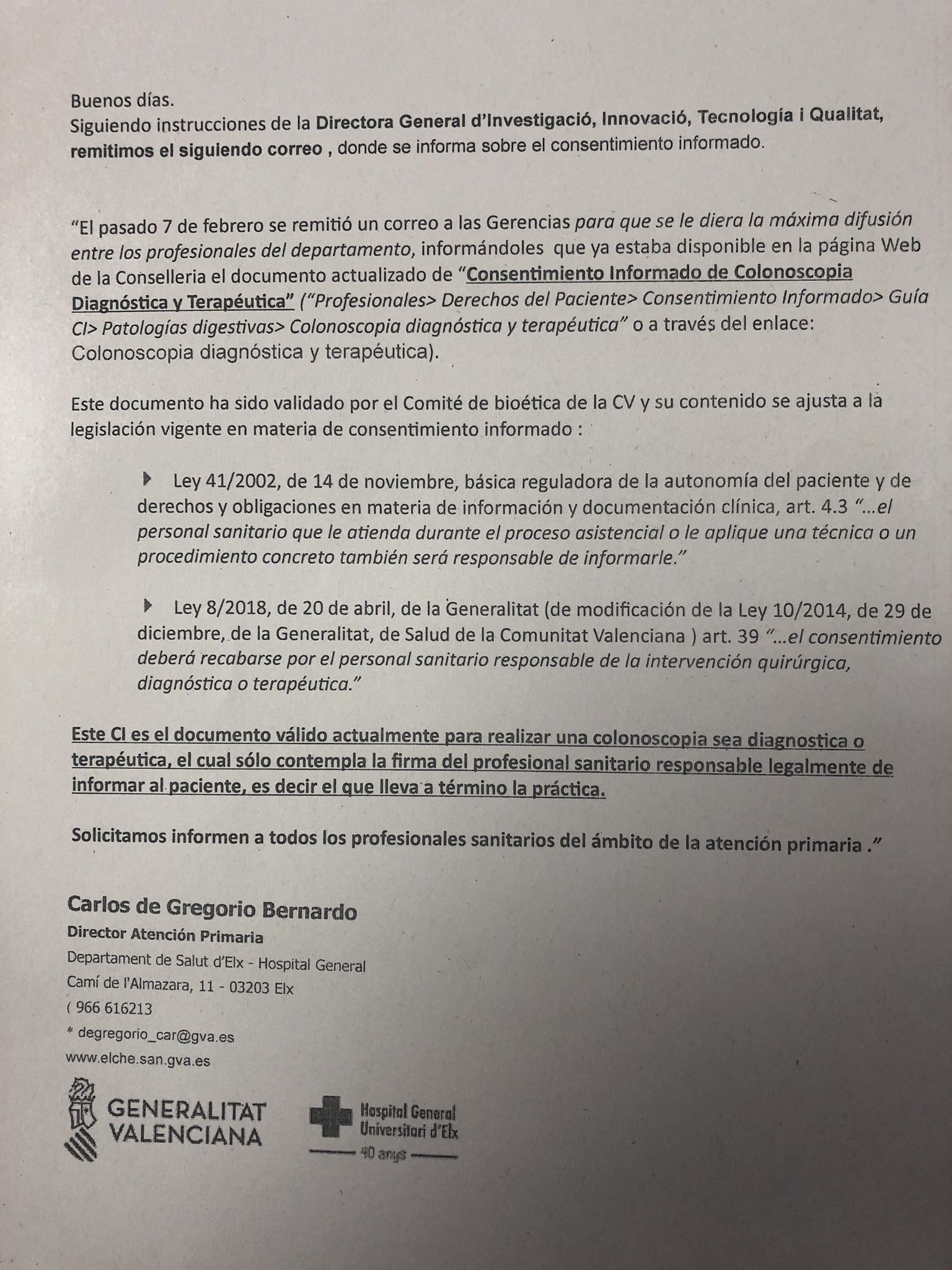 Actualmente en caso de que el resultado del análisis de sangre oculta en heces sea positivo se cita al paciente de forma automática con su médico de familia. De esta forma, nos encontramos con estos pacientes citados en huecos de cinco o pocos más minutos. En este tiempo se debe explicar al paciente, generalmente alarmado, lo que significa el positivo de la prueba, qué es una colonoscopia y para qué sirve, obtener su consentimiento, valorar el riesgo anestésico, rellenar un extenso protocolo y los documentos derivados del mismo. Se nos ha insistido en la importancia de dedicar el tiempo necesario a informar adecuadamente al paciente para que llegue bien preparado a la colonoscopia y «no se pierda una cita valiosa». Todo esto es imposible si queremos hacerlo con un mínimo de calidad en cinco minutos y en agendas ya saturadas.