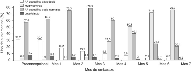 En la etapa preconcepcional y primer mes de embarazo se tomaba el acido fólico como único suplemento, y con dosis excesivas en un treinta por ciento de los casos. A partir del segundo mes la proporción de mujeres que utilizaban más de un tipo de suplementos (en forma de polivitamínicos) fue aumentando hasta superar el 50% a partir del tercer mes de embarazo. No se indican como tales en el estudio la asociaciones de acido fólico con iodo o con vitamina B12.