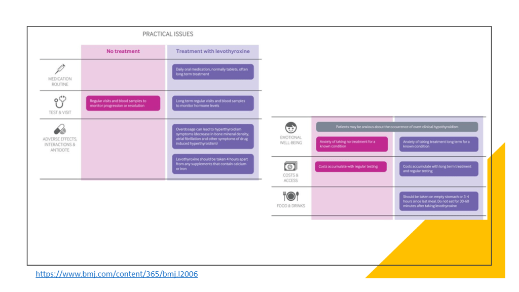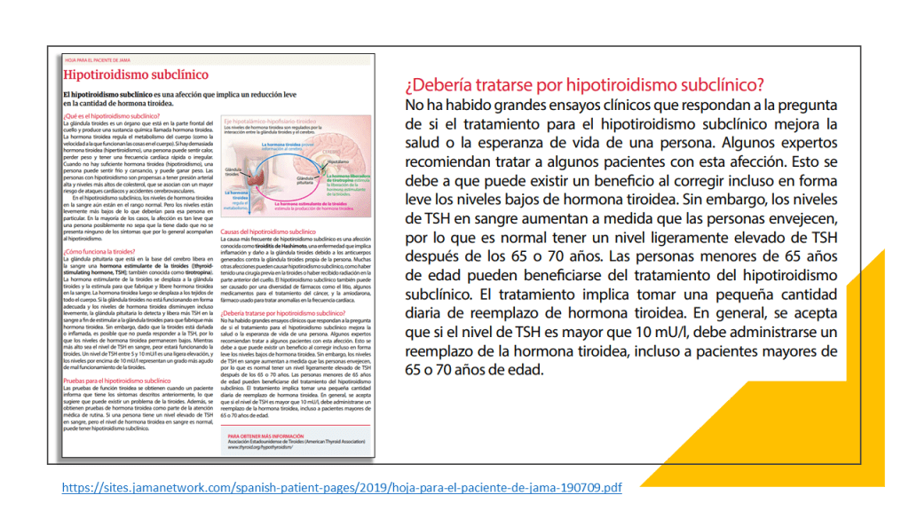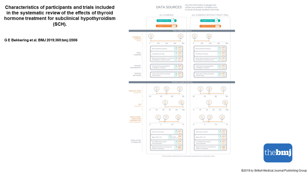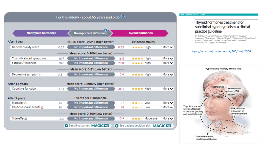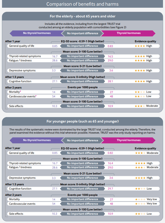 Estos resultados y algunos más se muestran en una clara y útil infografía multicapa que permite de forma rápida ver los resultados con los beneficios y daños relativos y absolutos del tratamiento con hormonas tiroideas frente a no tratar, así como un resumen visual de la recomendaciones de esta revisión.