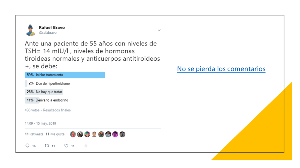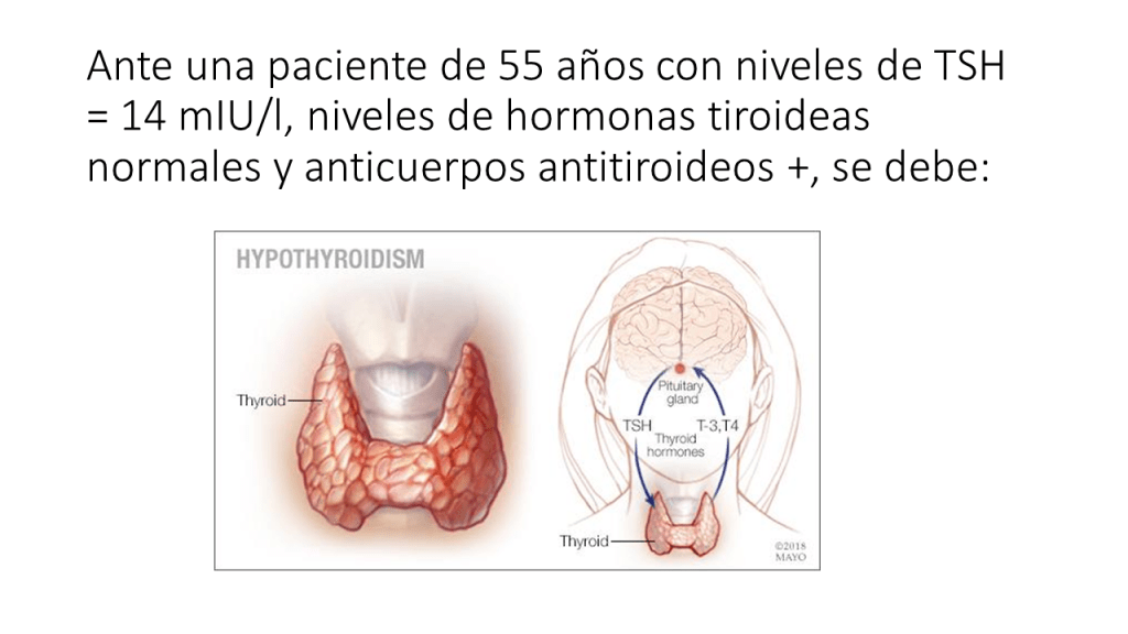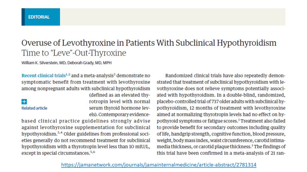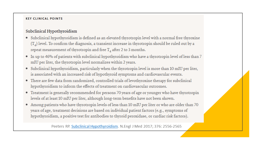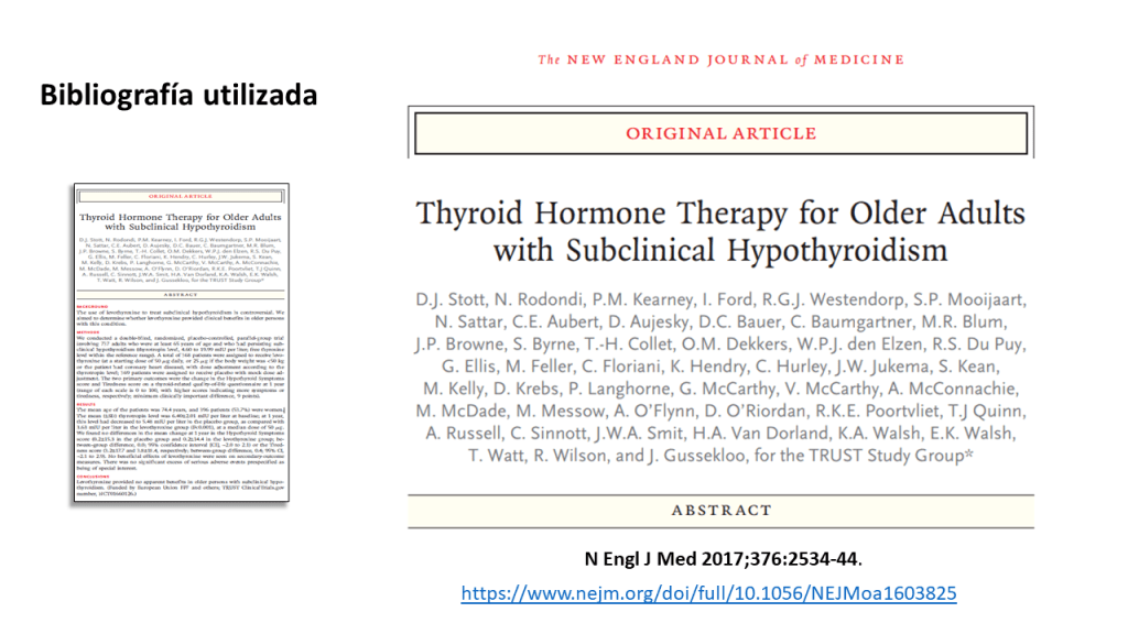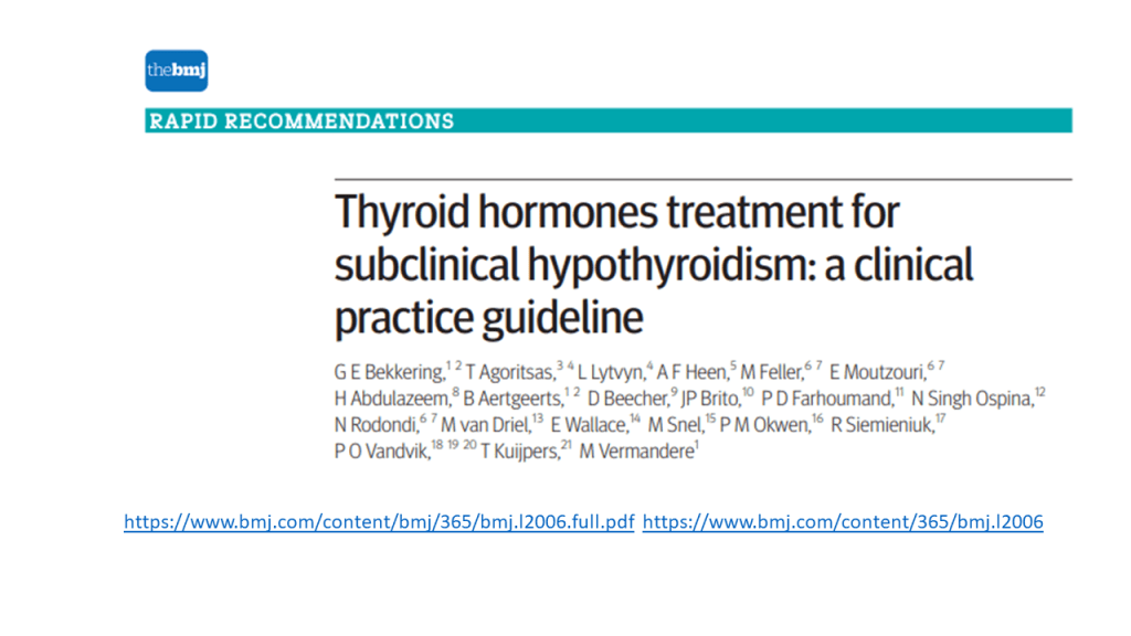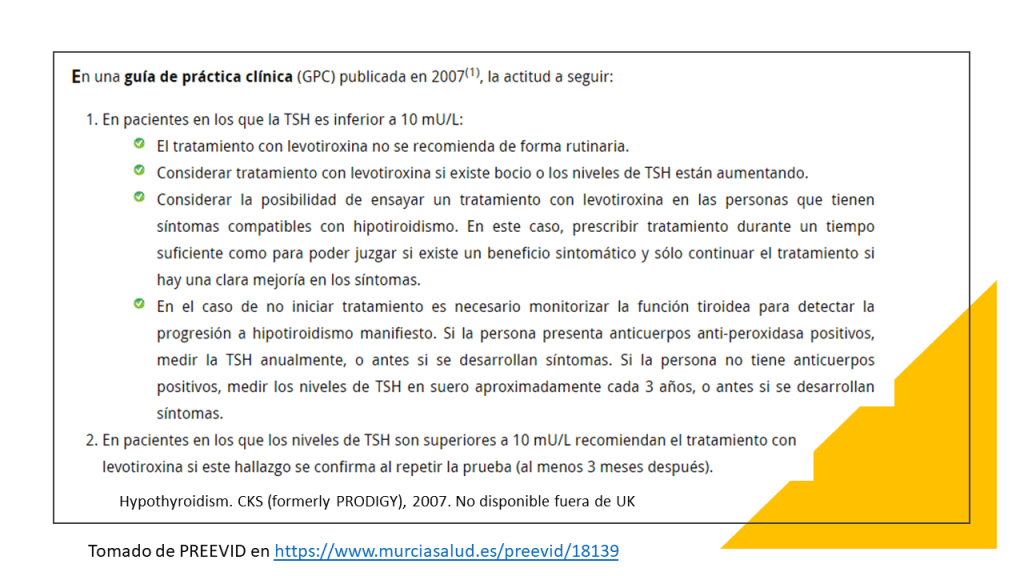 La práctica médica actual recomienda tratar a adultos con hormonas tiroideas cuando los niveles de hormona estimulante de la tiroides (TSH) son superiores a 10 mUI /L, el nivel de hormonas tiroideas es normal (el conocido hipotiroidismo subclínico o HSC) y los anticuerpos antitiroideos son positivos. Sin embargo, una guía de practica clínica reciente recomienda NO hacerlo salvo contadas excepciones (embarazadas o deseo de embarazo, jóvenes por debajo de 30 años, síntomas importantes y niveles de TSH > 20mIU/L).