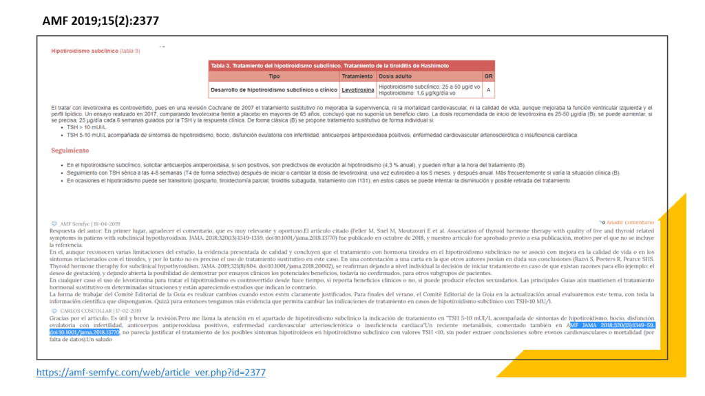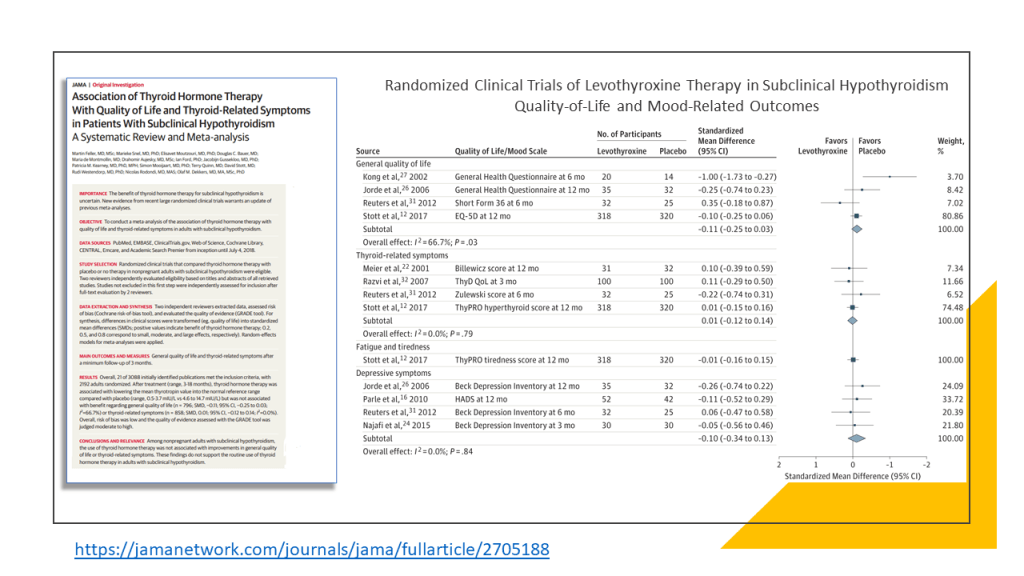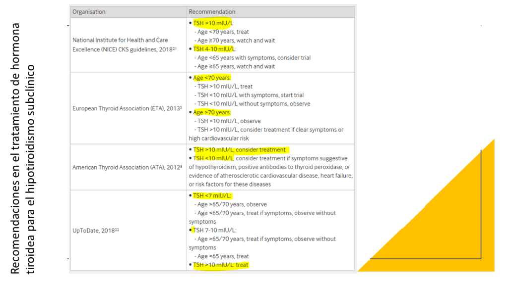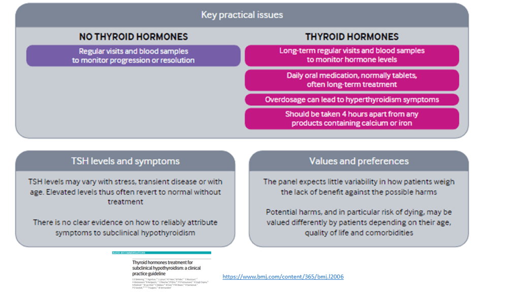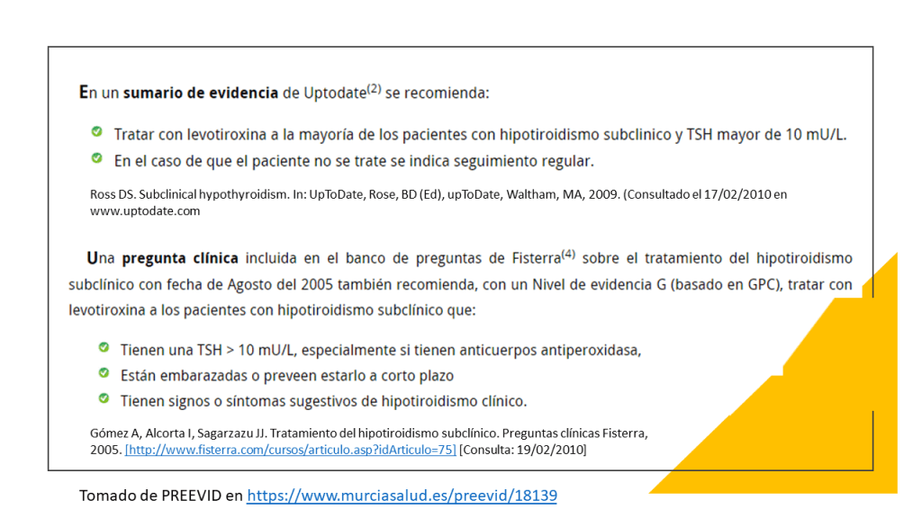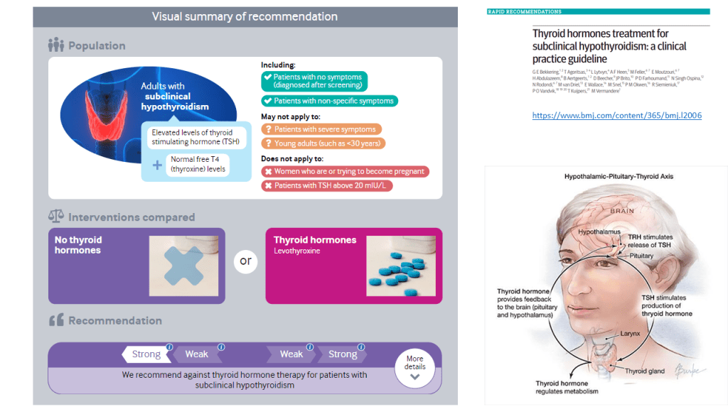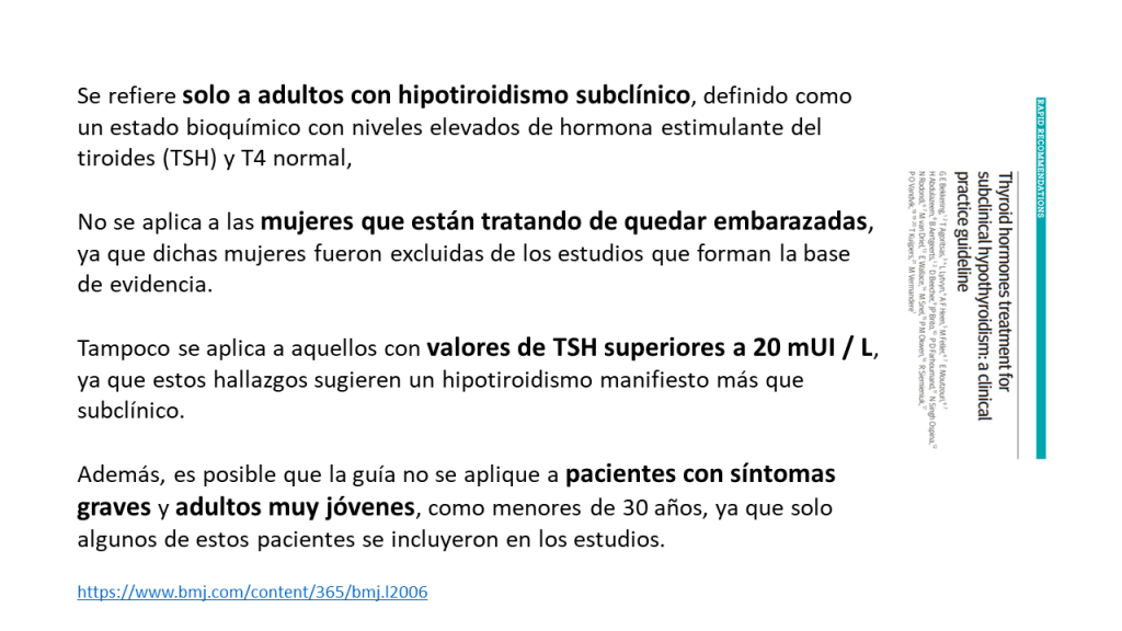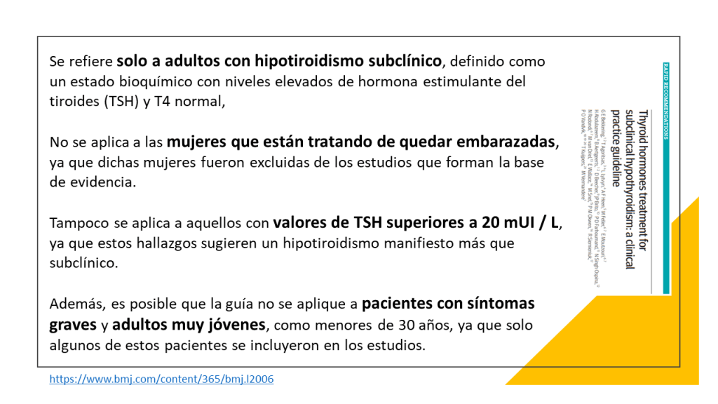 Las recomendaciones de esta nueva guía rápida se basan en una revisión sistemática, publicada previamente en JAMA, en la que se incluyeron en total 21 ensayos clínicos con 2192 participantes. Esta revisión incluía los resultados de un ensayo publicado en el 2017. Se vio que los adultos con HSC, el tratamiento con hormonas tiroideas no muestra beneficios consistentes y clínicamente relevantes, en síntomas relacionados con el déficit de función tiroidea, incluidos síntomas depresivos, fatiga e índice de masa corporal (evidencia de calidad moderada a alta), tampoco parece estar relacionado de manera significativa con la mejora de los ítem que definen la calidad de vida. Las hormonas tiroideas tendrían poco o ningún efecto sobre los eventos cardiovasculares o la mortalidad (evidencia de baja calidad)