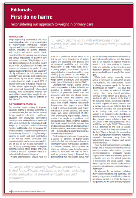 El estigma sobre el peso no solo se dirige a los pacientes. Como médico con peso elevado, en el Reino Unido, yo (Sebastián CK Shaw), experimente numerosos incidentes siendo avergonzado públicamente o señalado como una historia de advertencia por colegas en entornos de atención primaria y secundaria. Tales experiencias son validadas por los hallazgos recientes de un estudio norteamericano, en el que se encontró que el 87% de los médicos albergan un sesgo anti gordos implícito y donde los colegas de mayor peso se sentían preocupados. Curiosamente, cuando se les preguntó explícitamente, la mayoría de los participantes dijeron que tenían bajos niveles de sesgo hacia los médicos de mayor peso, lo que sugiere que muchos pueden no ser conscientes de sus sesgos 3 .