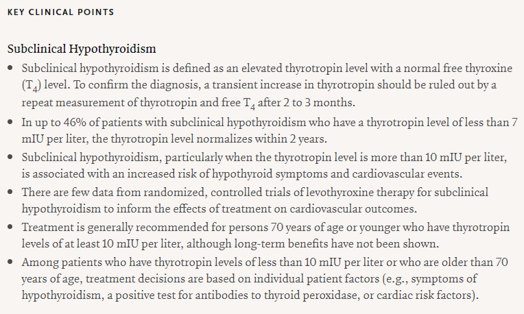 La práctica médica actual recomienda tratar a adultos con hormonas tiroideas cuando los niveles de hormona estimulante de la tiroides (TSH) son superiores a 10 mUI /L, el nivel de hormonas tiroideas es normal (el conocido hipotiroidismo subclínico o HSC) y los anticuerpos antitiroideos son positivos. Sin embargo, una guía de practica clínica reciente recomienda NO hacerlo salvo contadas excepciones (embarazadas o deseo de embarazo, jóvenes por debajo de 30 años, síntomas importantes y niveles de TSH > 20mIU/L).