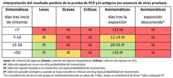 La RT- PCR se debería realizar ante cualquier caso clínicamente sospechoso de infección por COVID-19. Un resultado positivo de la prueba RT-PCR, en un caso sospechoso de COVID-19 sintomático es indicativo de infección activa. Un resultado negativo, ante una elevada sospecha clínico-epidemiológica para SARS-CoV-2, obliga a repetir la RT-PCR en una nueva muestra. Los falsos negativos son debidos a la toma inadecuada, la pobre eliminación del virus o un retraso en el procesamiento prolongado. Si fuese de nuevo negativo la detección de IgM mediante una prueba serológica tipo ELISA confirmaría el diagnóstico.
