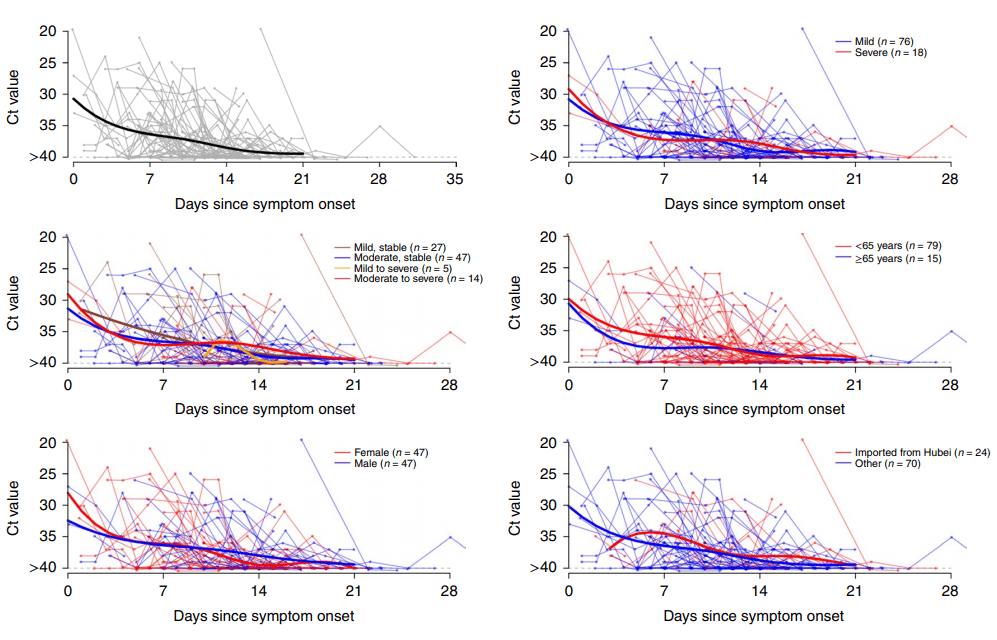 Los infectados por el COVID-19 presentan en su mayoría una alta carga viral en tracto respiratorio superior, desde 2-3 días antes del inicio de los síntomas, hasta alcanzar la máxima concentración entre 5º-7º día y prácticamente desaparece al decimo día. Por este motivo la rentabilidad de la prueba RT-PCR en muestras del tracto respiratorio superior, en casos no graves, es máxima en la primera semana de los síntomas, decayendo mucho posteriormente.