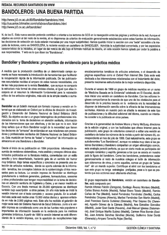 Bandolier y Bandolera: proyectiles de evidencia para la práctica clínica. 1999