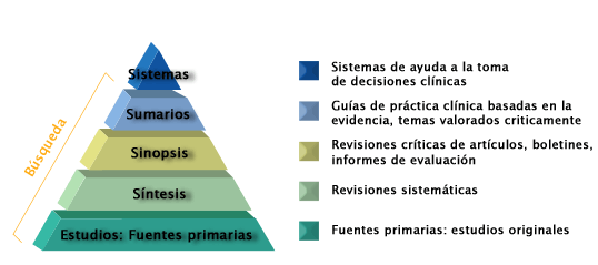 Una década después del inicio del movimiento de la medicina basada en la evidencia en la década de 1990, Haynes -uno de los padres de la MBE- lanza una representación gráfica, explicativa y jerarquizada en forma de pirámide de este modelo conceptual: la famosa pirámide 4 S [2]. Con los años y como buen proceso inflacionario la pirámide se convirtió en un edificio de seis pisos o capas, vigente hasta la actualidad y que ha sido utilizada en la búsqueda de información científico-médica, en la docencia y en la conformación de sistemas informáticos de ayuda en la toma de decisiones.