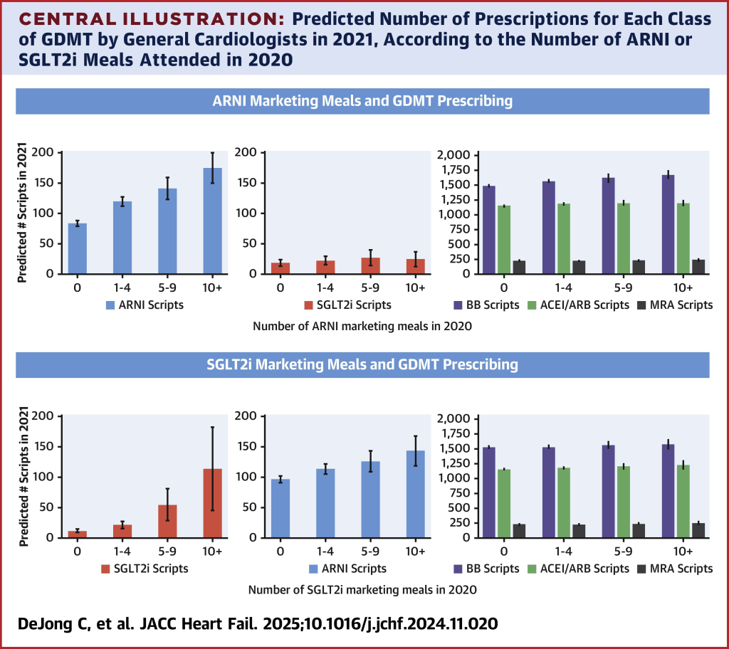 La revista Journals of the American College of Cardiology: Heart Failure (si hay una revista solo para Insuficiencia cardiaca) publica un articulo con le titulo de: Marketing directo al médico y aceptación del tratamiento médico óptimo para la insuficiencia cardiaca con fracción de eyección reducida, donde se investiga la asociación entre las comidas que invita la industria farmacéuticas, dentro de su estrategias de marketing y los niveles de prescripción de los medicamentos recomendados por las guías de práctica clínica sobre insuficiencia cardíaca (IC) con fracción de eyección reducida *.