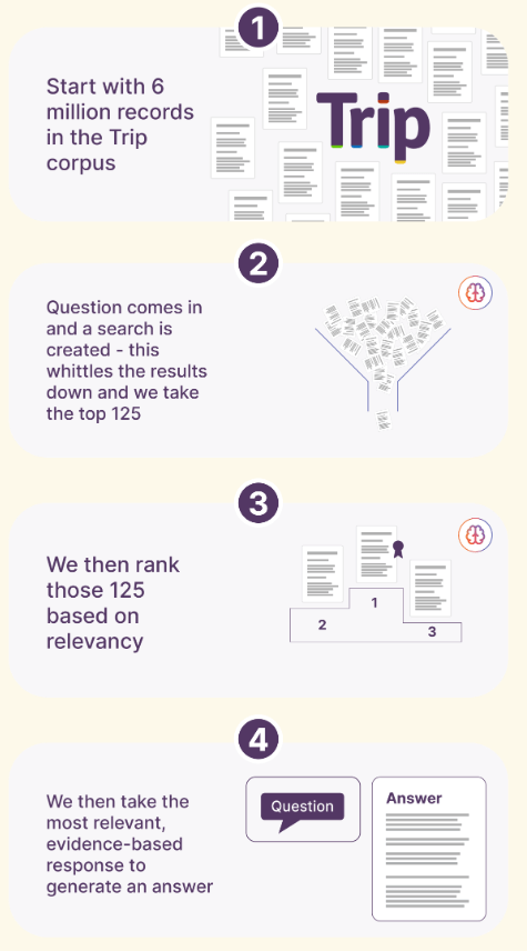 Como en otros proyectos de IA conversacional, el usuario envía su pregunta clínica en lenguaje natural, tal y como se la haría a un colega. La IA procesa su pregunta: interpreta la consulta, identifica los componentes clínicos clave y busca en la base de datos de evidencias de alta calidad seleccionadas por Trip. Cuando se recuperan y sintetizan las pruebas, el sistema da prioridad a fuentes fiables, como guías de práctica clínica y revisiones sistemáticas.