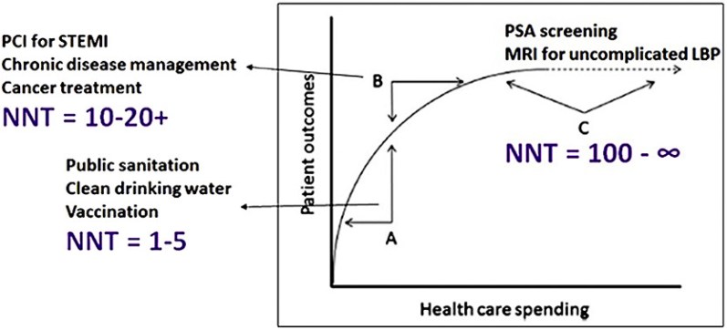 Figura.- Basado en la disminución de la función de utilidad en la economía: el punto A representa una atención de alto valor ya que el gasto conduce a grandes ganancias en los resultados. El punto B representa niveles intermedios de ganancia basados en gastos adicionales. El punto C representa una atención de bajo valor, en la que el gasto adicional no se asocia con una mejora significativa en los resultados de los pacientes. Este es el ‘plano de la curva’.
