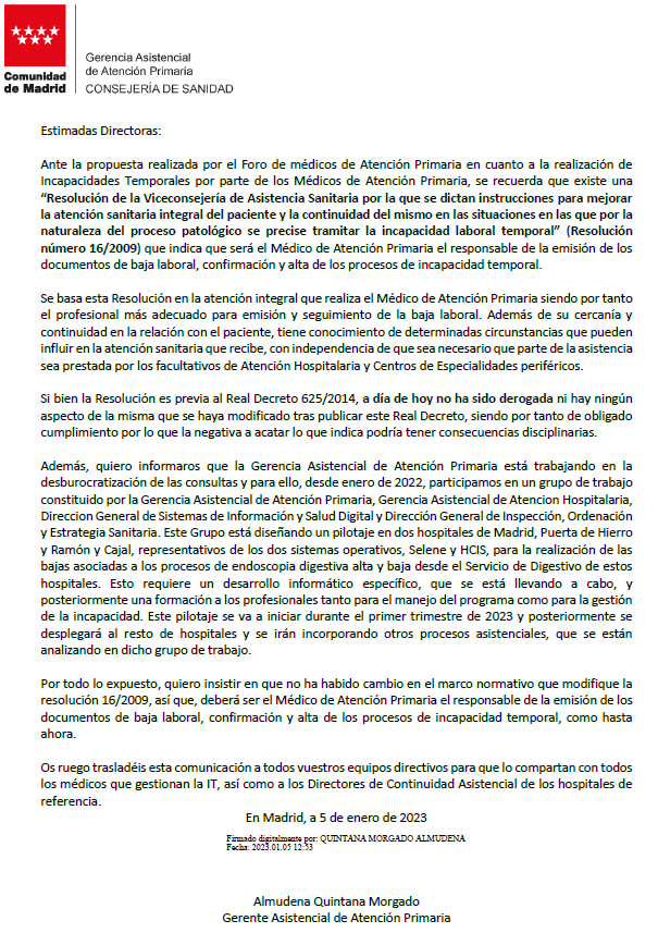 - Ante la situación crítica de Atención Primaria nos ratificamos en nuestra decisión de ajustarnos estrictamente a la legalidad a partir del 1 de Enero de 2023, en lo relativo a la emisión de los partes que deriven únicamente de nuestras tareas clínicas, debiendo cada facultativo de todos las especialidades y niveles asistenciales de forma análoga los derivados de su actividad.
