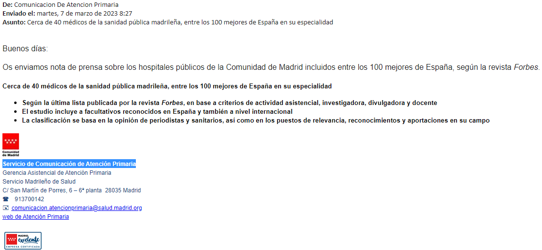 Enseguida empezaron a difundirlo a través de su pagina web y la prensa y radio adictas. Es más, en un abracadabrante ejercicio de cinismo se distribuyo vía correo corporativo a los centros de salud, enviado directamente por el servicio de comunicación de atención primaria.