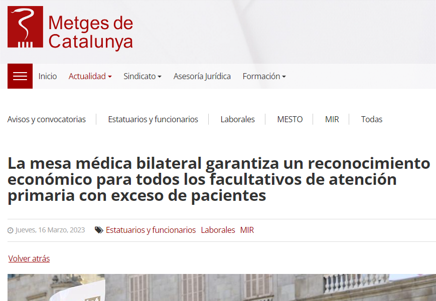 La mesa médica bilateral garantiza un reconocimiento económico para todos los facultativos de atención primaria con exceso de pacientes. : “Los facultativos de los CAP, de forma voluntaria, pueden aceptar un 10%, un 15%, un 20%, un 25% o un 33% más de pacientes en sus contingentes, con un complemento económico vinculado para cada tramo y un aumento proporcional de la jornada de trabajo.”