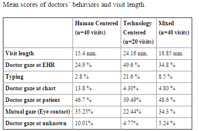 Los resultados indican que en el grupo centrado en la tecnología la consulta duro más pero la mirada mutua (pacientes-médicos) era más corta que en los otros dos grupos de forma significativa. Además, en el estilo tecnológico, los médicos eran más propensos a cambiar su mirada hacia el ordenador cuando los pacientes les miraban y pasar más tiempo tecleando. En este grupo los pacientes eran más propensos a mirar a otro lugar cuando los médicos contemplaban el ordenador, lo que podría ser un indicador de separación.