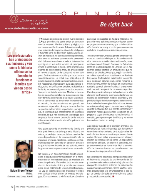 Después de enterarse de un nuevo servicio que permite a la gente estar en contacto con los muertos, Martha solitaria y afligida conecta con su difunto novio……Así comienza el primer episodio del segundo año de la inteligente y futurista serie de televisión inglesa Black Mirror. En realidad, no conecta con su prometido, sino con un software que recrea la personalidad del muerto en base a toda la información que figura en sus redes sociales. Al principio le ayuda a sobrellevar el duelo, pero pronto se da cuenta que necesita más, de ahí a aceptar el nuevo proyecto de la compañía, va un solo paso. Se trata de un androide que reproduce a su extinta pareja; un robot que, al igual que el programa previo, imita su manera de ser, escribir, reaccionar, interactuar y cuya apariencia física, salvo insignificantes detalles, es idéntica a la de él; incluso en algunos aspectos, superior. Tampoco es esta la solución. Martha lo descubre en pequeños detalles de la convivencia diaria y termina confinando a su novio “automático” al sitio donde se almacenan los recuerdos: el desván, de donde solo es recuperado en ocasiones especiales. Aunque de esta ficción se pueden extraer ideas importantes como, por ejemplo, la identidad que presentamos en las redes sociales, lo que nos interesa es la analogía que se puede hacer con el desarrollo de la historia clínica electrónica en la atención primaria de nuestro país.