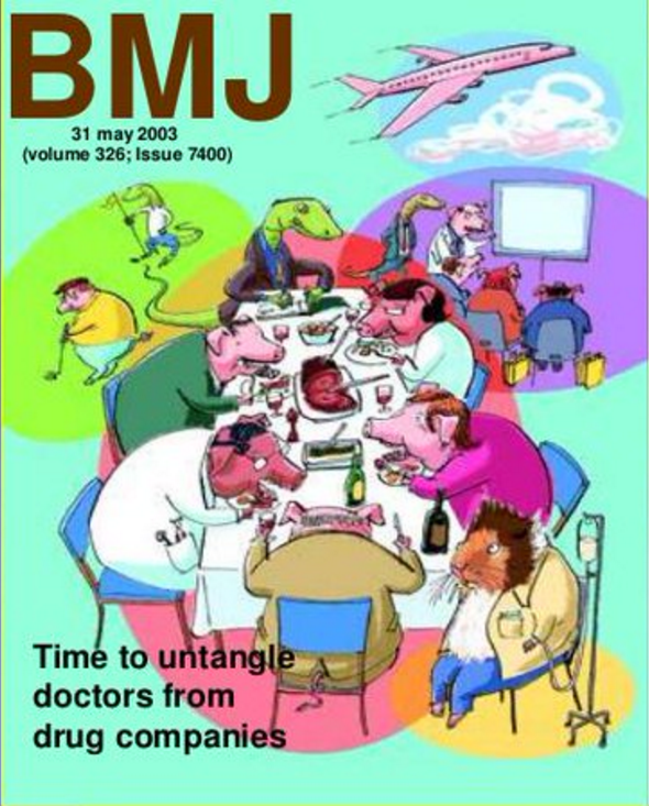 Hace 22 años la revista BMJ en su portada mostraba una caricatura sobre el tejemaneje entre médicos y compañías farmacéuticas. Mostraba a los médicos como cerdos glotones, a los representantes de la industria como serpientes y a los pacientes, como un pobre roedor que atónito, contemplaba el espectáculo. Desde entonces han sido muchos los artículos, libros, documentales, no siembre desde el lado de la medicina, que han puesto de manifiesto esta peligrosa trama, sin que nada parezca haber cambiado.