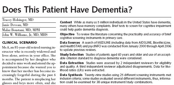 La revista JAMA publica regularmente una serie excepcional conocida como «el examen clínico racional» en el número de 6 de junio e 2007, aparece un artículo dedicado al diagnóstico de la demencia donde se repasan los instrumentos de cribado y diagnóstico que existen para esta enfermedad. De recomendable lectura.