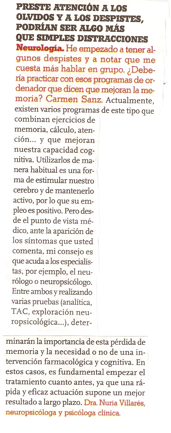 Otra banalidad sobre la que se suele consultar con frecuencia es sobre las pérdidas de memoria, si bien en este caso parece que la queja se alimenta de consejos ignorantes y del miedo que como efecto colateral desatan las campañas de divulgación y de ayuda a los enfermos con enfermedad de alzheimer (EA).