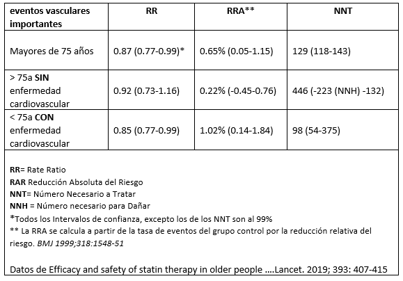Como vemos en la tabla, la reducciones del riesgo muestran diferencias pequeñas, mientras que los NNT son bastante altos. En los mayores de 75 años sin enfermedad vascular, las estatinas no parecen reducir los eventos vasculares principales: NNT 446 (NNH 223 a NNT 132), tampoco se observa en variables de muerte cardiovascular o muerte por cualquier causa.