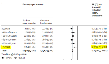 El tratamiento con estatinas produce reducciones significativas en los eventos vasculares mayores independientemente de la edad, pero hay menos evidencia directa de beneficio entre los pacientes mayores de 75 años que aún no tienen enfermedad vascular oclusiva. Esta limitación ahora está siendo abordada por ensayos adicionales.