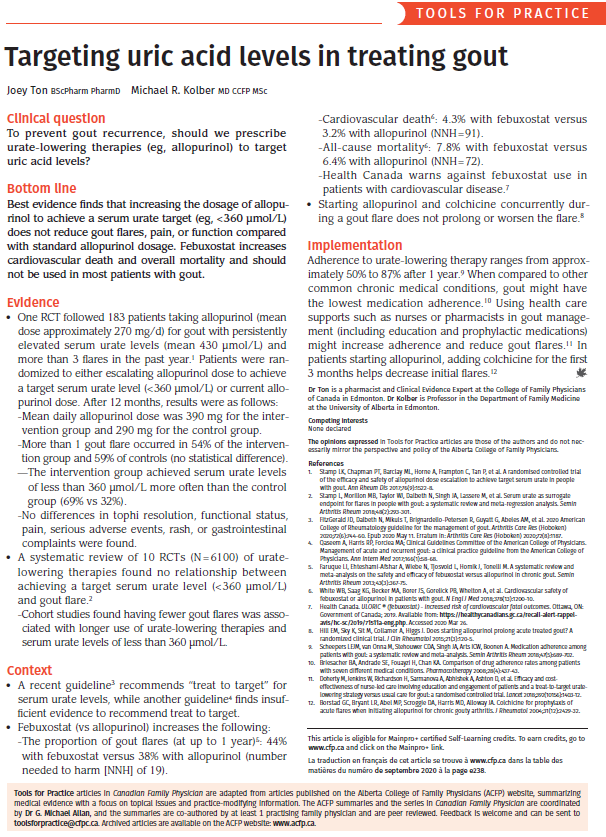 Tools for practice es una sección de la revista Canadian Family Physicians (CFP) que adapta artículos publicados en la web del Alberta College of Family Physicians (ACFP), en concreto en este repositorio, viejo conocido de los que nos dedicamos a estas cosas de la evidencia y sus recursos en atención primaria. Esta publicación secundaria resume la evidencia de la literatura médica, con un enfoque preferente sobre temas de actualidad e información que modifique la práctica habitual. Los resúmenes son revisados por pares y al menos uno de los coautores, es un médico de familia en ejercicio.