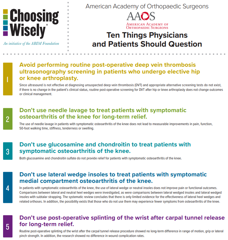 Por otro lado, una artroscopia de rodilla puede causar un daño al paciente y consumo inadecuado de recursos, por lo que se ha llegado a considerar una practica bajo valor en las recomendaciones de las sociedades médicas de varios países como Estados Unidos (y aquí), Canadá, Australia y Holanda.