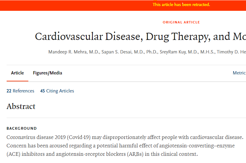 La segunda historia, también de beneficio, es sobre un artículo publicado el 1º de mayo en la prestigiosa revista New England Journal of Medicine donde se describe un aparente efecto beneficioso de los inhibidores de la ECA en COVID-19 y ningún efecto perjudicial de los bloqueadores de los receptores de angiotensina (ARA). Hay que hacer notar que hasta entonces circulaba la idea de que estos fármacos podrían ser perjudiciales por afectar a la enzima conversora de angiotensina que el virus utilizaba para ejercer su acción. Estas conclusiones, eran por tanto una buena noticia. El estudio se basaba en un registro obtenido de datos se habían reunido en una base de datos clínica internacional Surgical Outcomes Collaborative (Surgisphere)