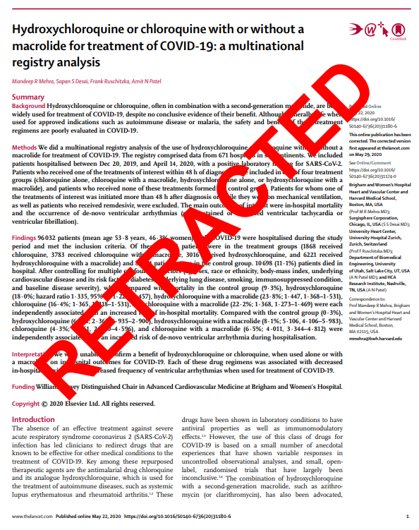 Sin embargo, despues de un procedimiento de revisión, el 2 de junio, los cinco autores escribieron una carta a la revista, donde decían: “Debido a que no se les otorgó a todos los autores acceso a los datos en bruto y los datos en bruto no se pudieron poner a disposición de un auditor externo, no podemos validar las fuentes de datos primarias subyacentes a nuestro artículo. Por lo tanto, pedían que se retractara el artículo, como así se hizo.